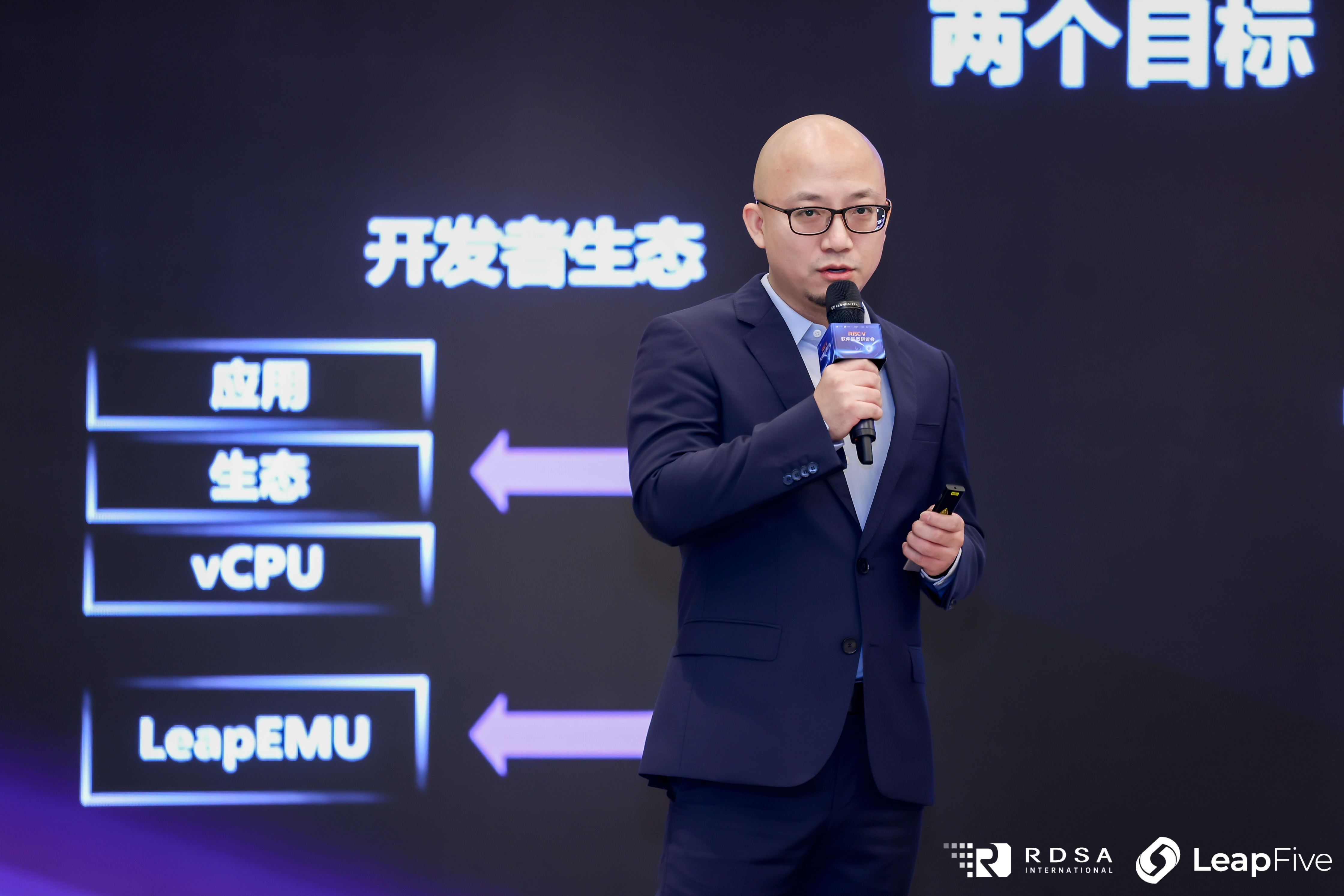 跃昉科技首席运营官袁博浒在大会上发布全球首款支持超128核RISC-V RVA23企业级模拟平台LeapEMU