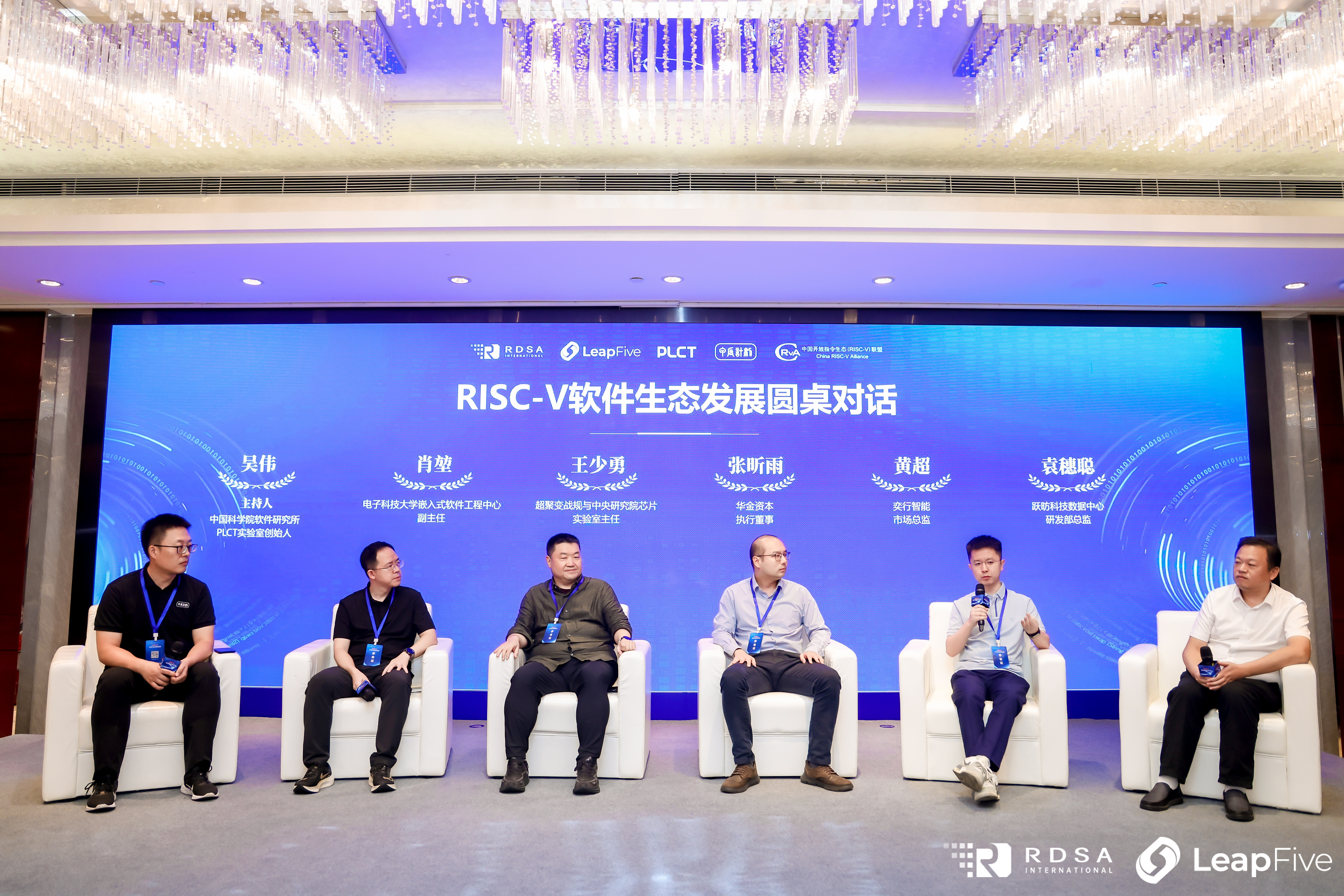 圆桌对话环节则由中国科学院软件研究所PLCT实验室创始人吴伟主持,电子科技大学嵌入式软件工程中心副主任肖堃、超聚变战规与中央研究院芯片实验室主任王少勇、华金资本执行董事张昕雨、奕行智能市场总监黄超、跃昉科技数据中心研发部总监袁穗聪等嘉宾,围绕“RISC-V软件生态发展”展开深入讨论。