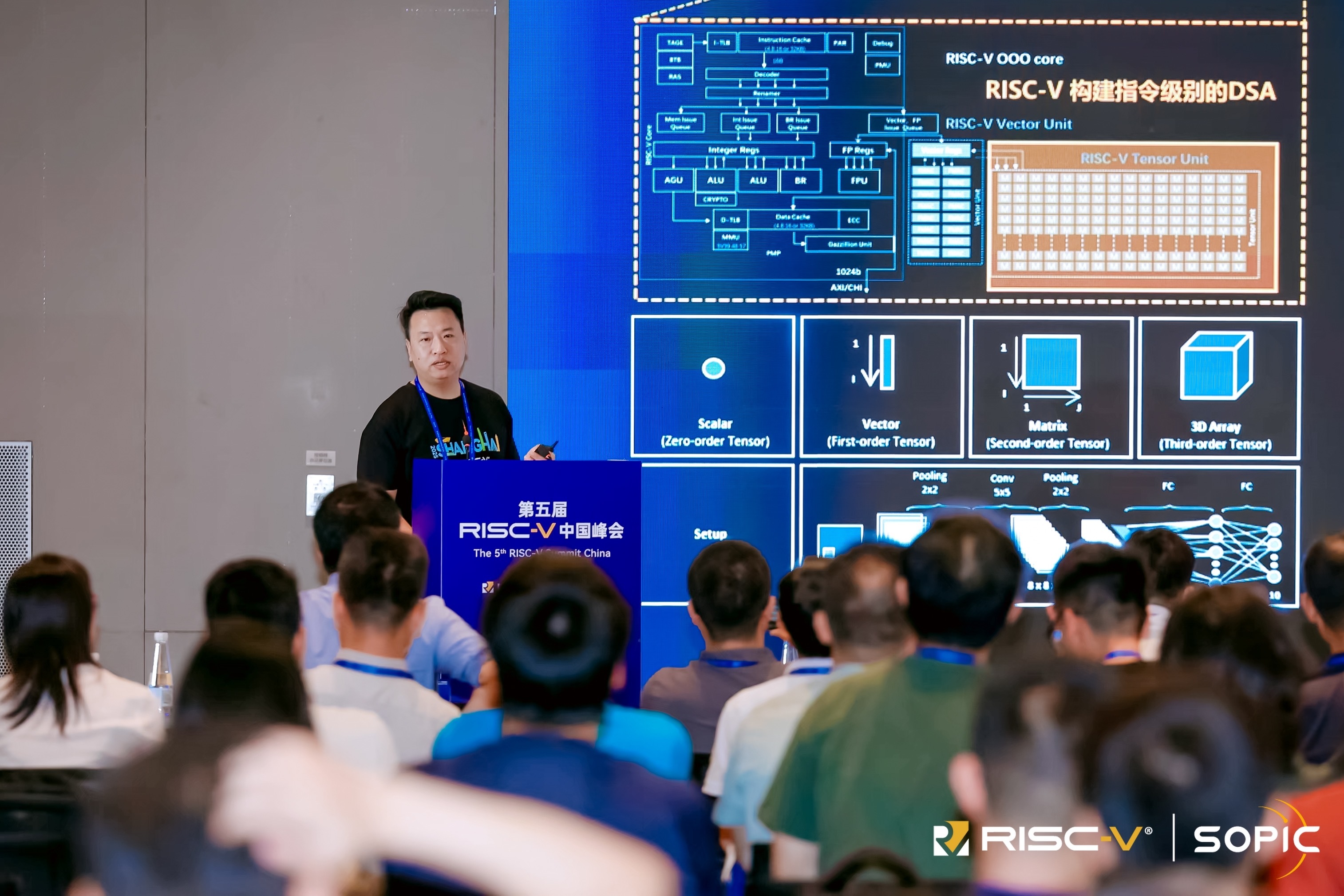 袁博浒在演讲中指出,随着AI和高性能计算需求的爆发式增长,传统芯片架构面临算力堆砌、能耗攀升等挑战。RISC-V架构的开放性与灵活性,结合DSA的专用化设计,能够更高效地释放硬件性能。