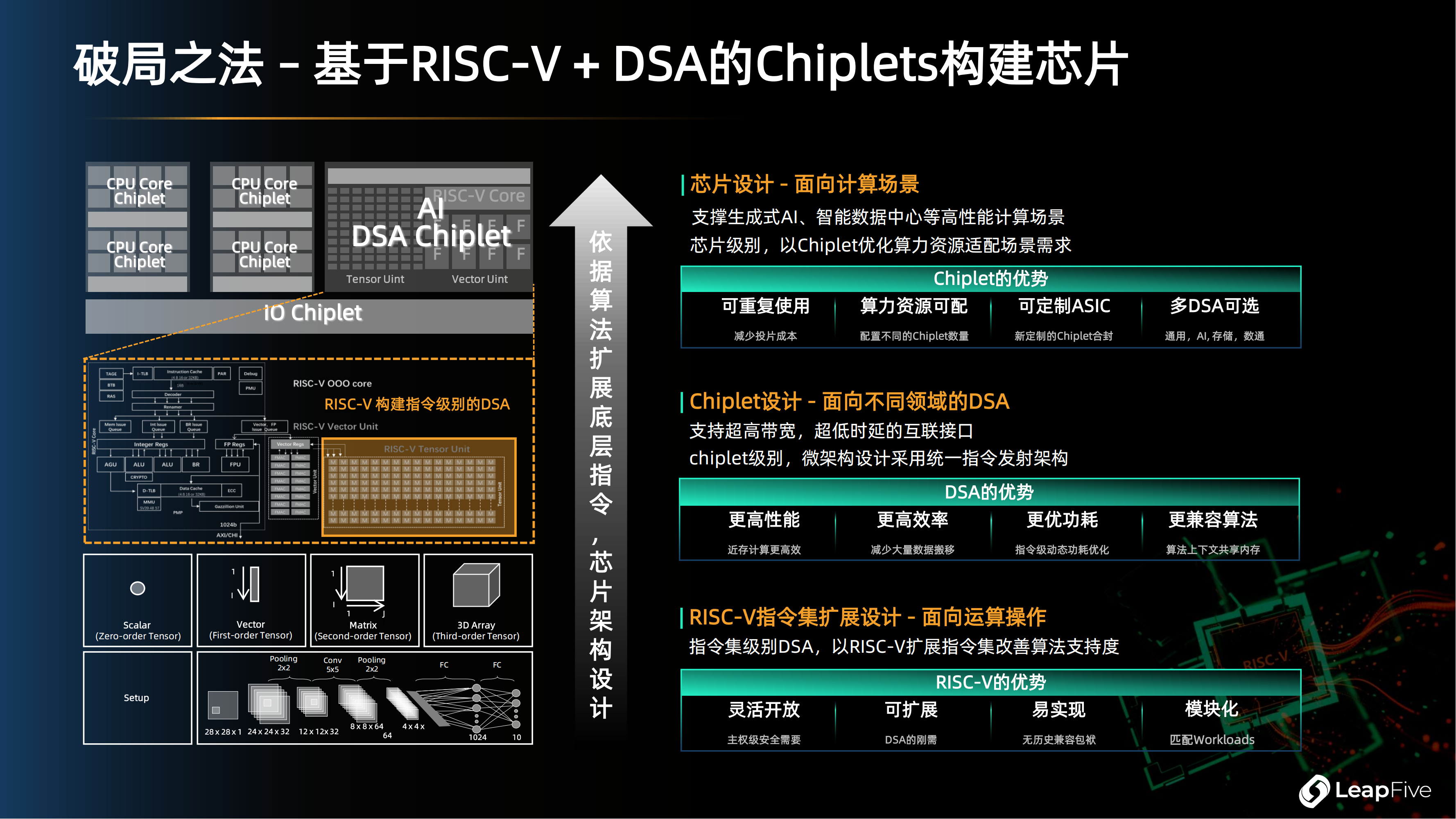 袁博浒详细阐述了DSA架构从算法到芯片的完整技术路径,这一路径可分为三个关键层次:指令集扩展设计、Chiplet设计和芯片设计。
