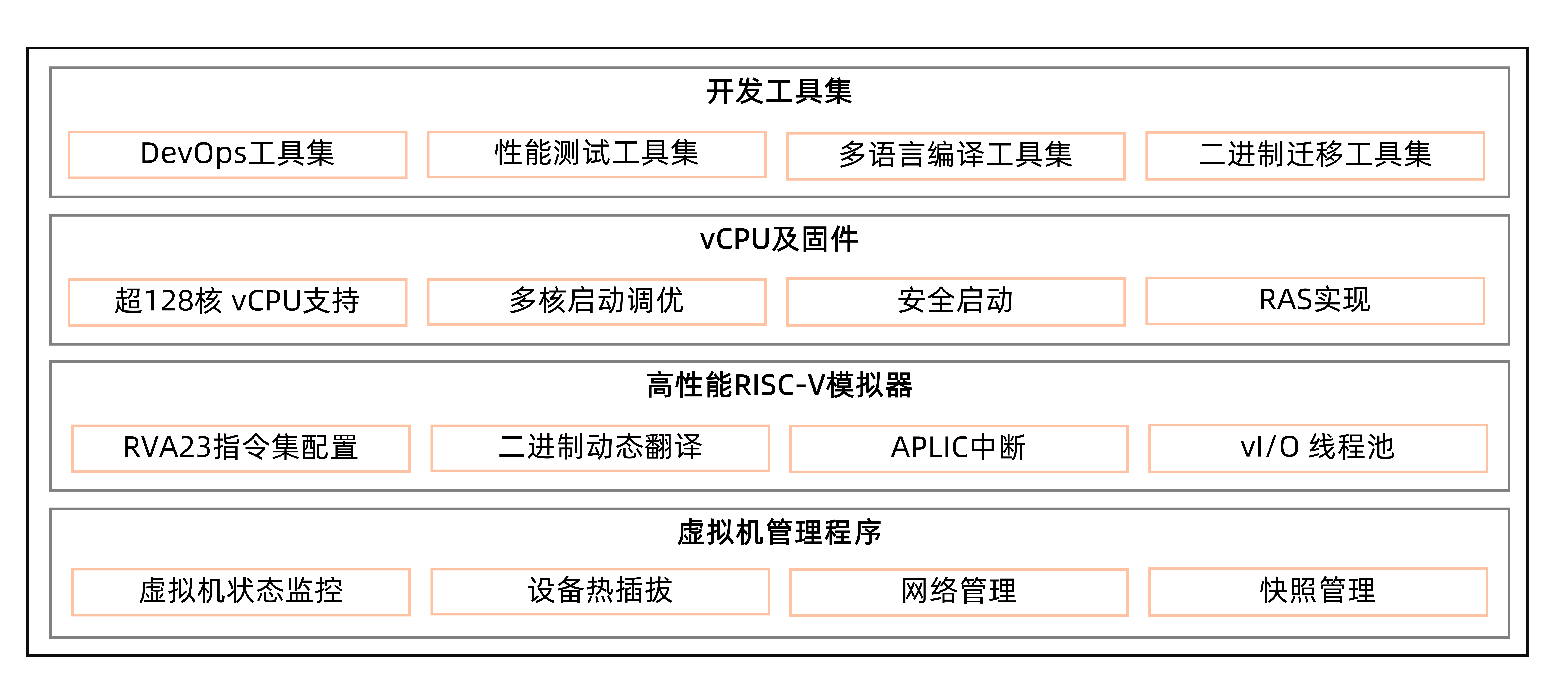 完整支持RISC-V RVA23规范 支持CPU、MMU及各种外设的模拟 支持NUMA,APLIC,二进制动态翻译、vI/O线程池 支持IOMMU,实现基于H扩展的嵌套虚拟化 支持定制指令集扩展,包括非RVA23规范指令集扩展 |